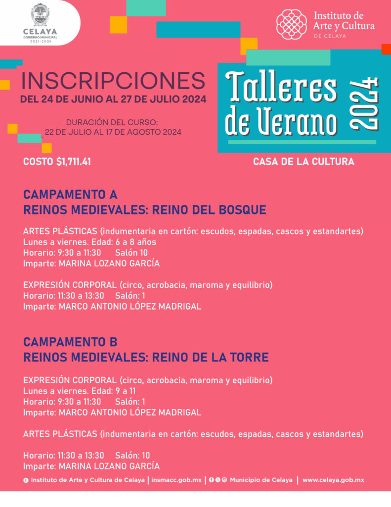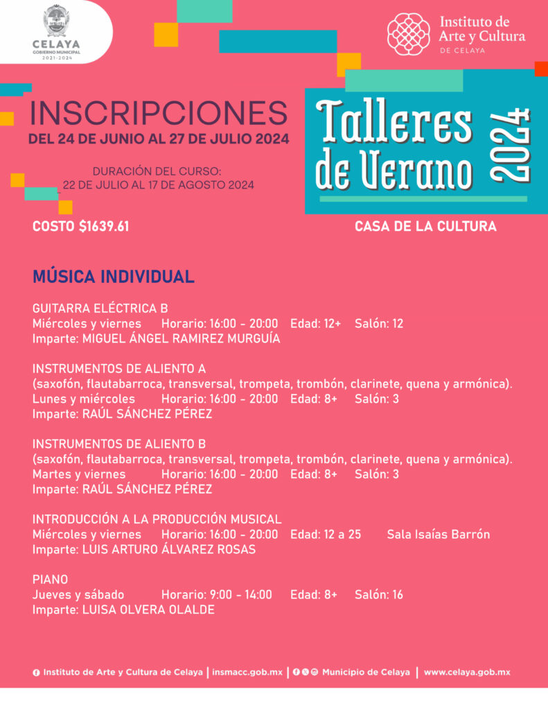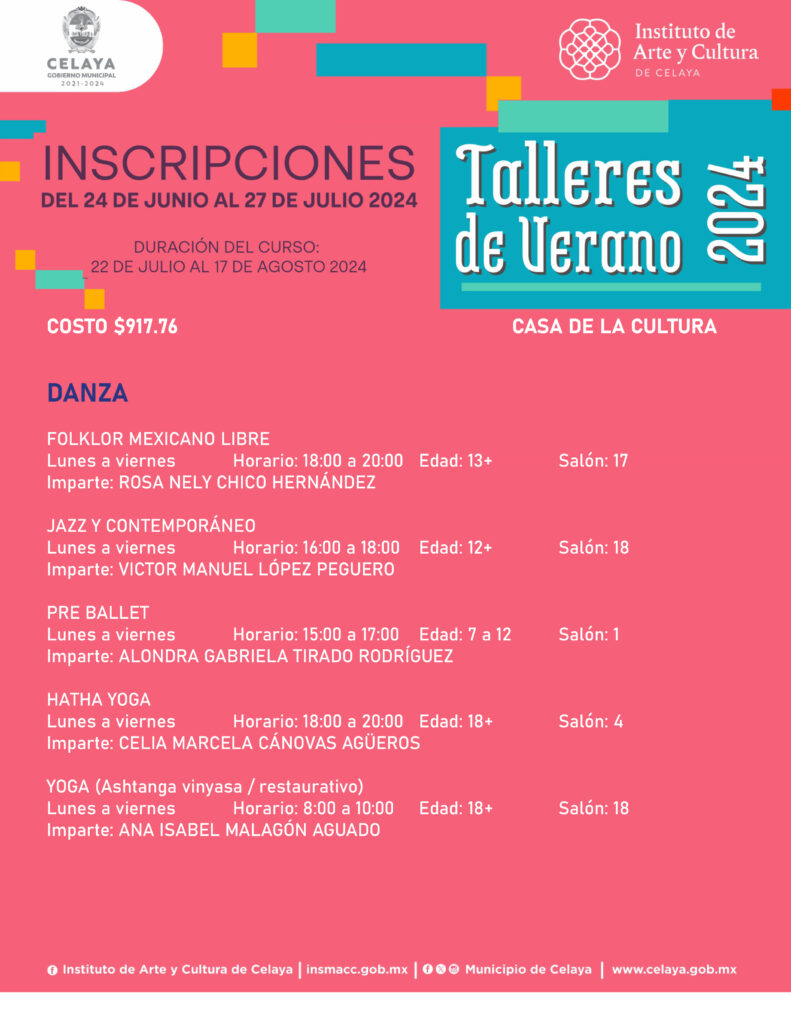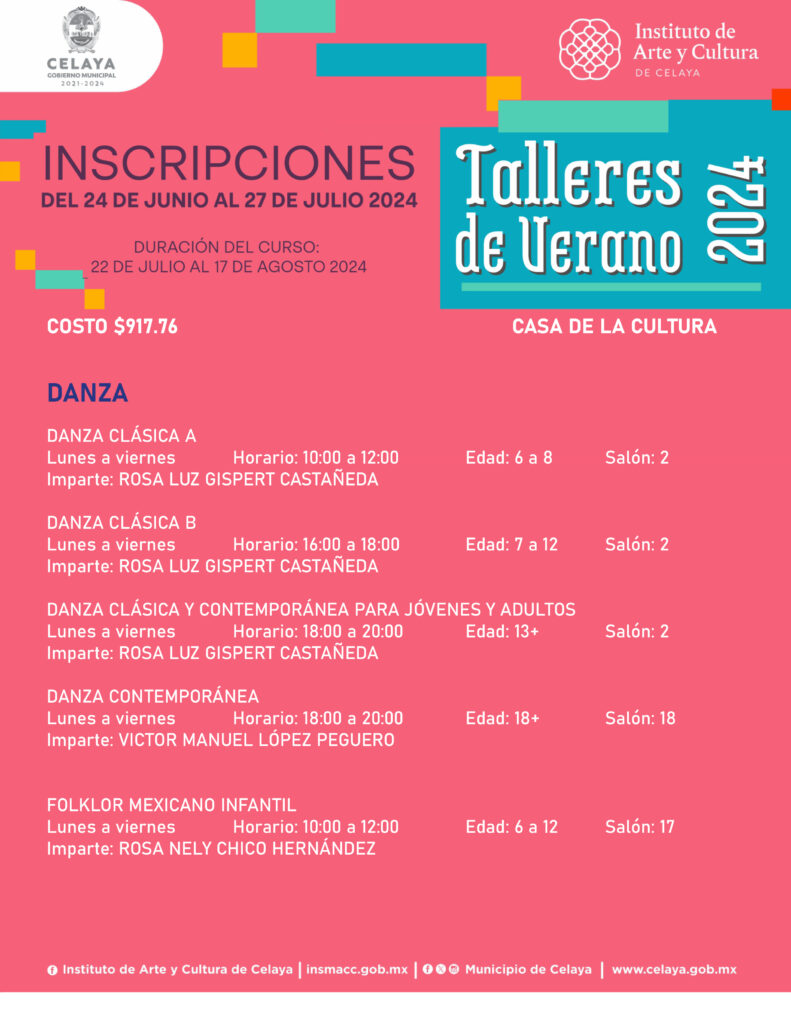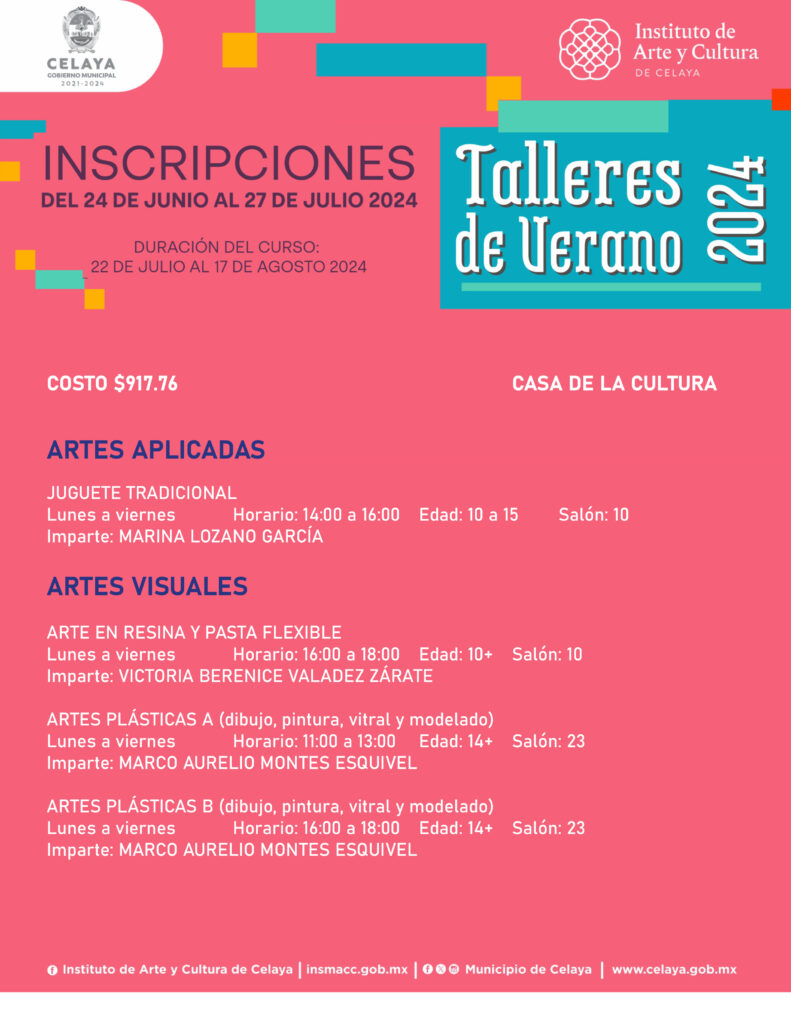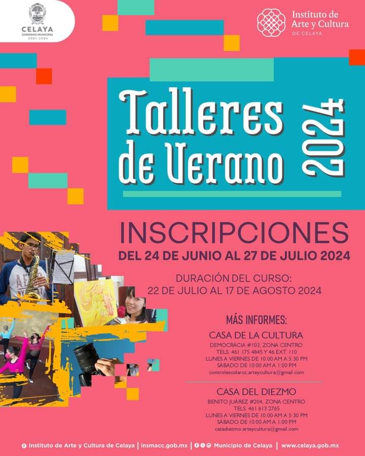 En este verano, tú puedes participar en los talleres que ofrece Casa de la Cultura. El Instituto de Arte y Cultura de Celaya te invita.